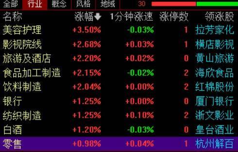 早盘,A股大消费板块走强,美容护理、旅游、食品、零售、影视等方向纷纷拉升。拉芳家化、安记食品、海欣食品、红棉股份、杭州解百、浙文影业、横店影视等多股涨停。